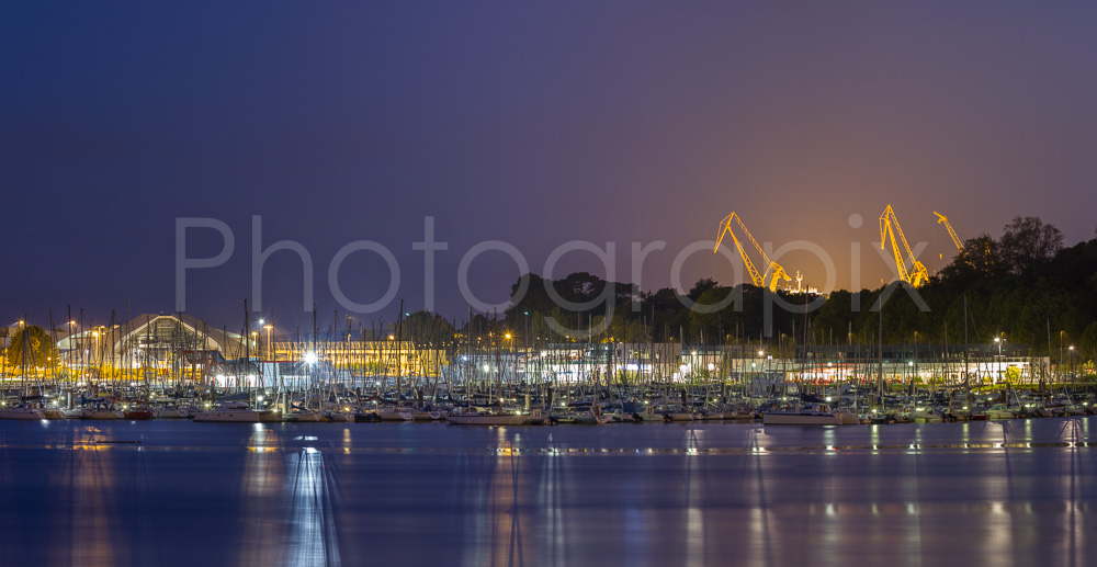 Les grues brillent de milles feux derrière l'Océanopolis et le port de plaisance...