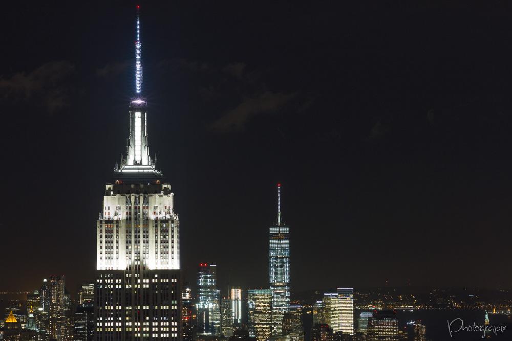 En haut du Rockfeller Center (premier plan : Empire State Building ; second plan : World Trade Center)